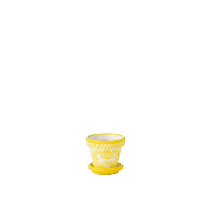Geef je planten een mediterraans tintje met deze stijlvolle geel-witte bloempot, compleet met bijpassende schotel.