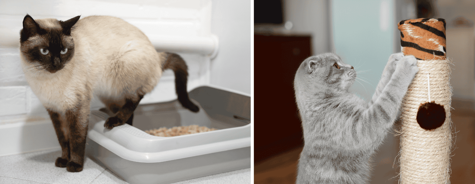 Krabpalen, kattenbakken, mandjes en speeltjes