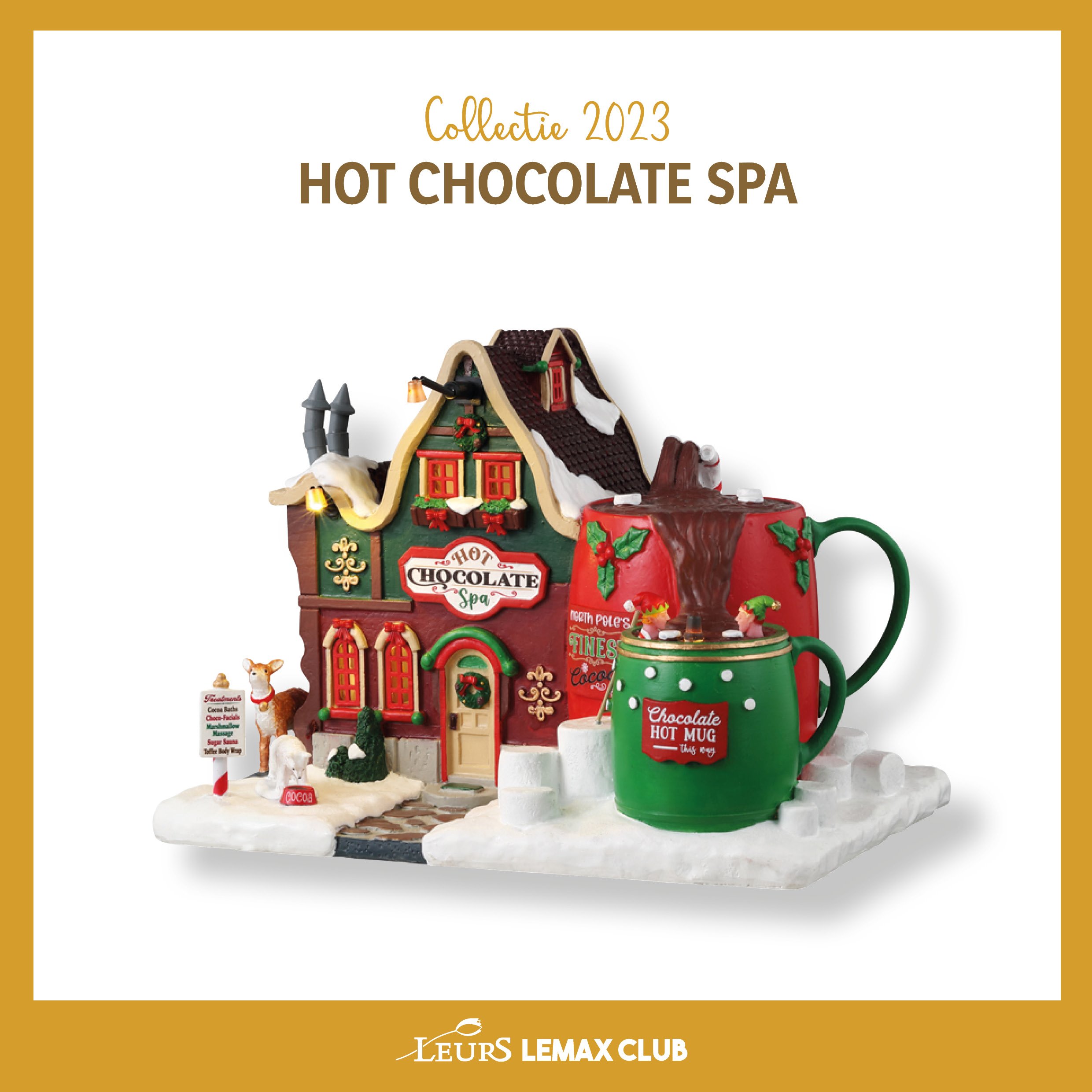 Welkom bij de Lemax Hot Chocolate Spa! Ons huisje mag dan klein zijn, maar onze mok is gigantisch! Laat je onderdompelen in een warme choco-oase terwijl je knus zit in de mok van je dromen. Hot Chocolate Spa behoort tot het kerstdorp thema Santa’s Wonderland.