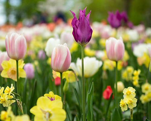 Bollen planten hoeft niet in keurige ruitjes, voor een natuurlijk en speels effect strooi je de bollen nonchalant uit in de border en plant je ze waar ze neerkomen zijn.