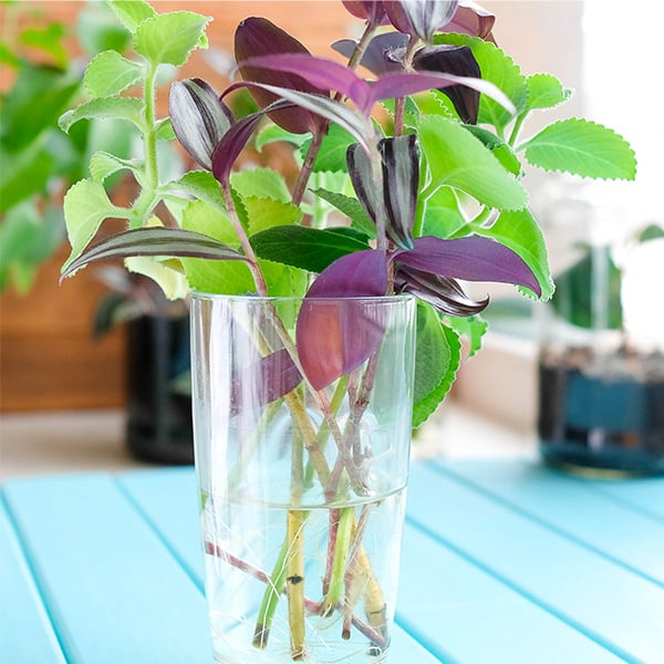 Nog zo'n snelgroeier: tradescantia. Knip een paar uiteinden van de takken af en plaats ze in water of vochtige potgrond. De stekken zullen dan vanzelf wortels aanmaken!