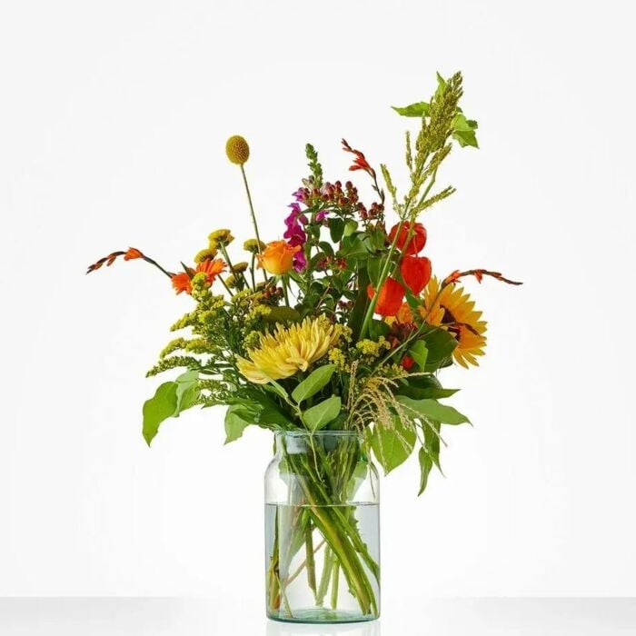 Een vrolijk boeket met prachtige oranje herfsttinten.