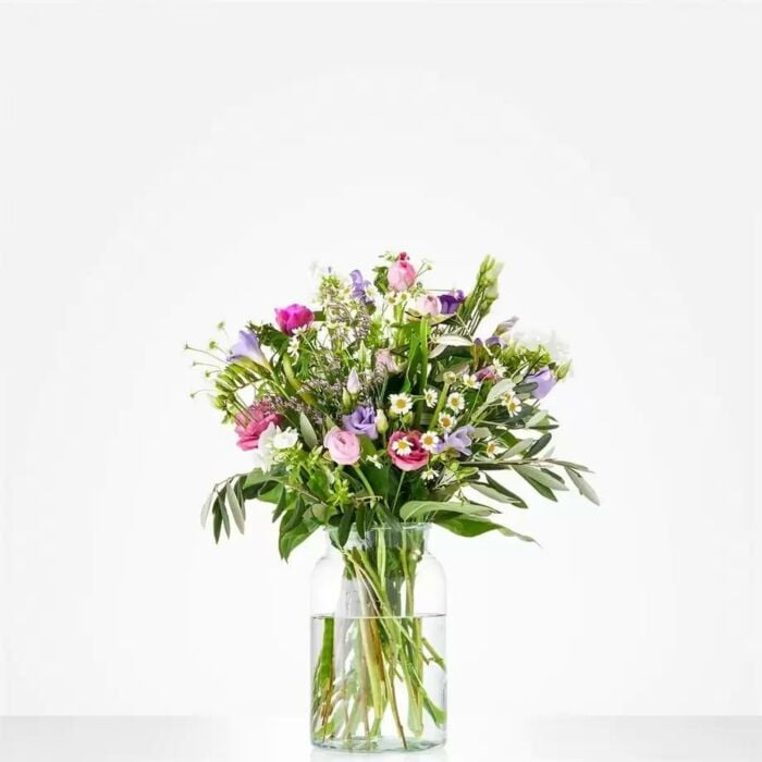 Een vrolijk en kleurrijk bloemboeket in roze en paarse kleuren.