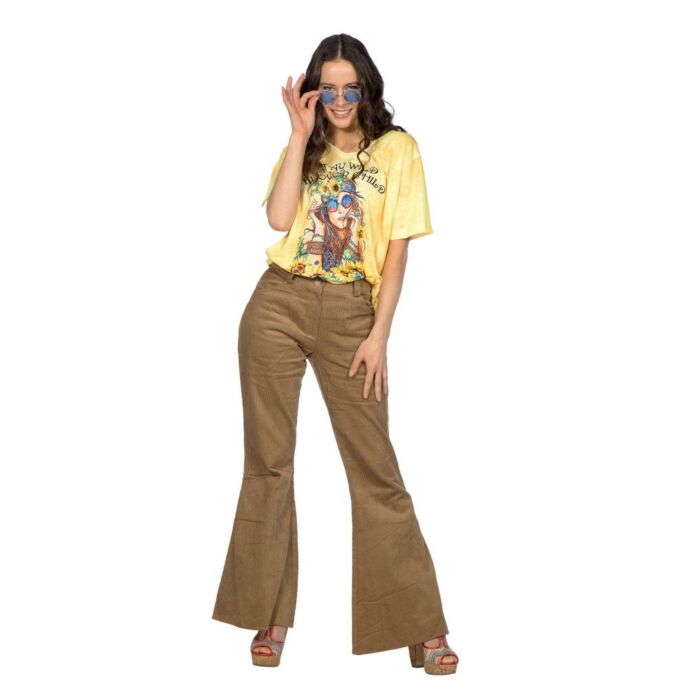 Deze bruine ribfluwelen flairbroek heeft een prachtige retro uitstraling dankzij de zachte stof en wijde pijpen, waardoor hij ideaal is voor een comfortabele, elegante en opvallende Vastelaovend look waarmee je moeiteloos kunt bewegen en feesten tijdens carnaval, perfect te combineren met kleurrijke tops of glitteraccessoires en verkrijgbaar bij Tuincentrum Leurs Venlo met een carnavalsafdeling vol inspiratie.