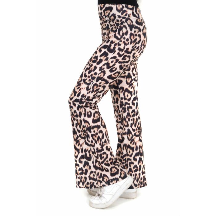 Deze flared panterprint broek is een echte carnavalsblikvanger voor Vastelaovend in Venlo en geeft jouw outfit een stoere en feestelijke uitstraling verkrijgbaar bij Tuincentrum Leurs Venlo.