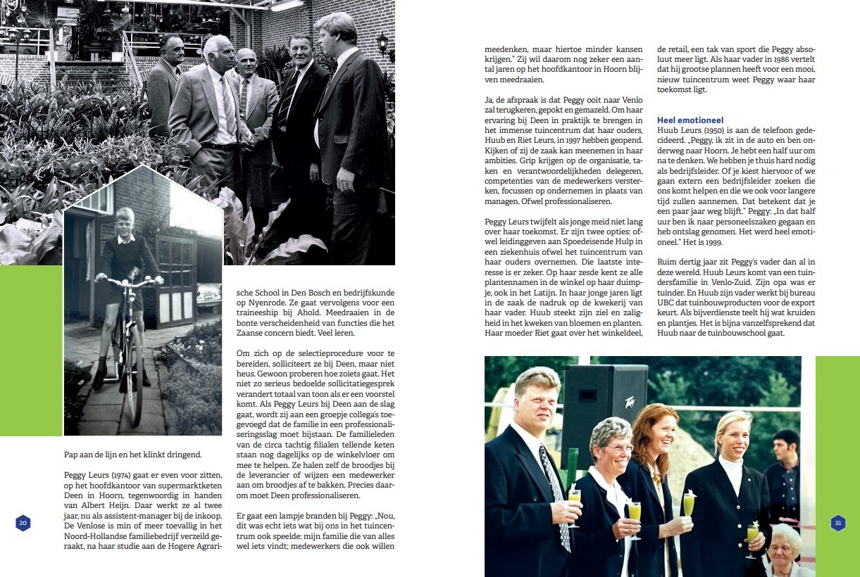 Peggy Leurs (1974) gaat er even voor zitten, op het hoofdkantoor van supermarktketen Deen in Hoorn, tegenwoordig in handen van Albert Heijn. Daar werkt ze al twee jaar, nu als assistent-manager bij de inkoop. De Venlose is min of meer toevallig in het Noord-Hollandse familiebedrijf verzeild geraakt, na haar studie aan de Hogere Agrarische School in Den Bosch en bedrijfskunde op Nyenrode. Ze gaat vervolgens voor een traineeship bij Ahold. Meedraaien in de bonte verscheidenheid van functies die het Zaanse concern biedt. Veel leren. Om zich op de selectieprocedure voor te bereiden, solliciteert ze bij Deen, maar niet heus. Gewoon proberen hoe zoiets gaat. Het niet zo serieus bedoelde sollicitatiegesprek verandert totaal van toon als er een voorstel komt. Als Peggy Leurs bij Deen aan de slag gaat, wordt zij aan een groepje collega’s toegevoegd dat de familie in een professionaliseringsslag moet bijstaan. De familieleden van de circa tachtig filialen tellende keten staan nog dagelijks op de winkelvloer om mee te helpen. Ze halen zelf de broodjes bij de leverancier of wijzen een medewerker aan om broodjes af te bakken. Precies daarom moet Deen professionaliseren. Er gaat een lampje branden bij Peggy: „Nou, dit was echt iets wat bij ons in het tuincentrum ook speelde: mijn familie die van alles wel iets vindt; medewerkers die ook willen meedenken, maar hiertoe minder kansen krijgen.” Zij wil daarom nog zeker een aantal jaren op het hoofdkantoor in Hoorn blijven meedraaien.