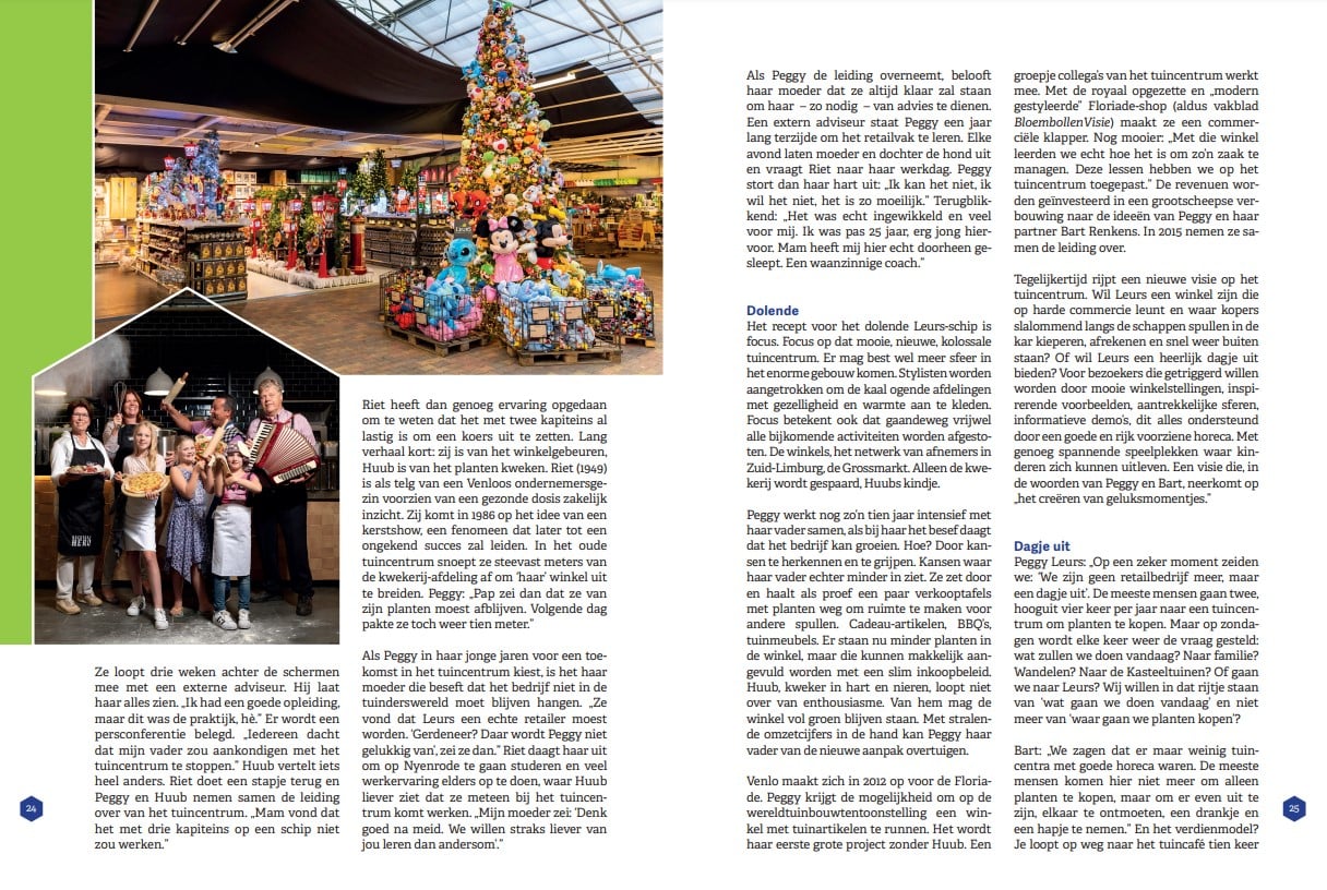 Het recept voor het dolende Leurs-schip is focus. Focus op dat mooie, nieuwe, kolossale tuincentrum. Er mag best wel meer sfeer in het enorme gebouw komen. Stylisten worden aangetrokken om de kaal ogende afdelingen met gezelligheid en warmte aan te kleden. Focus betekent ook dat gaandeweg vrijwel alle bijkomende activiteiten worden afgestoten. De winkels, het netwerk van afnemers in Zuid-Limburg, de Grossmarkt. Alleen de kwekerij wordt gespaard, Huubs kindje. Peggy werkt nog zo’n tien jaar intensief met haar vader samen, als bij haar het besef daagt dat het bedrijf kan groeien. Hoe? Door kansen te herkennen en te grijpen. Kansen waar haar vader echter minder in ziet. Ze zet door en haalt als proef een paar verkooptafels met planten weg om ruimte te maken voor andere spullen. Cadeau-artikelen, BBQ’s, tuinmeubels. Er staan nu minder planten in de winkel, maar die kunnen makkelijk aan gevuld worden met een slim inkoopbeleid. Huub, kweker in hart en nieren, loopt niet over van enthousiasme. Van hem mag de winkel vol groen blijven staan. Met stralen de omzetcijfers in de hand kan Peggy haar vader van de nieuwe aanpak overtuigen. Venlo maakt zich in 2012 op voor de Floriade. Peggy krijgt de mogelijkheid om op de wereldtuinbouwtentoonstelling een winkel met tuinartikelen te runnen. Het wordt haar eerste grote project zonder Huub. Een groepje collega’s van het tuincentrum werkt mee. Met de royaal opgezette en „modern gestyleerde” Floriade-shop (aldus vakblad BloembollenVisie) maakt ze een commerciële klapper. Nog mooier: „Met die winkel leerden we echt hoe het is om zo’n zaak te managen. Deze lessen hebben we op het tuincentrum toegepast.” De revenuen worden geïnvesteerd in een grootscheepse verbouwing naar de ideeën van Peggy en haar partner Bart Renkens. In 2015 nemen ze samen de leiding over.