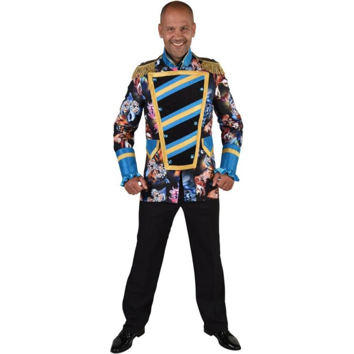 Zwarte mantel met gekleurde vlinders.