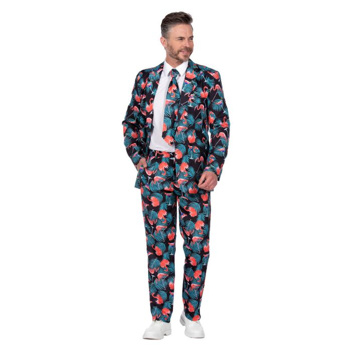 Deze tropische flamingo-pakset is een feestelijke en kleurrijke keuze voor carnaval, met een opvallende print van flamingo’s en palmbladeren die jouw outfit meteen laat opvallen. Het driedelige design bestaat uit een pantalon, jasje en bijpassende stropdas zodat je in één keer helemaal in stijl bent. Verkrijgbaar bij Tuincentrum Leurs in Venlo met een uitgebreide carnavalsafdeling vol inspiratie.