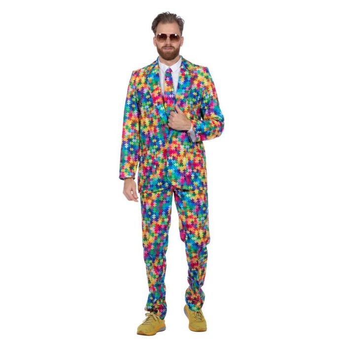 Deze pak puzzelstukjes is een opvallend driedelig carnavalskostuum met broek, jasje en stropdas in een speelse puzzelprint waardoor je outfit direct kleurrijk en feestelijk oogt en je gegarandeerd opvalt tijdens elke optocht of carnavalsavond; combineer het pak met een fel shirt en leuke accessoires en je bent helemaal klaar om in stijl carnaval te vieren. Verkrijgbaar bij Tuincentrum Leurs in Venlo met een uitgebreide carnavalsafdeling vol inspiratie.