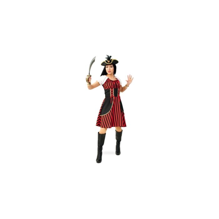 Dit piraat dameskostuum maakt jouw Carnaval outfit stoer en stijlvol met rode strepen en speelse details verkrijgbaar bij Tuincentrum Leurs in Venlo.