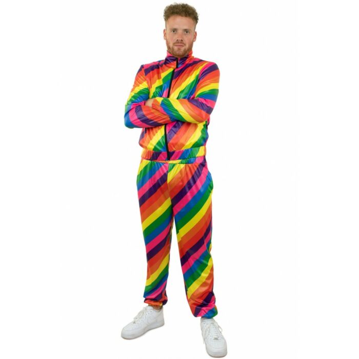 Trainingspak voor heren met regenboog strepen. Deze set bestaat uit een broek met steekzakken en een jas met ritssluiting. Verkrijgbaar in verschillende maten. Kom gezellig naar onze winkel om alle carnavalskleding in het echt te bewonderen en om te passen.
