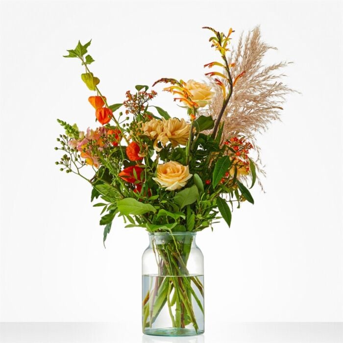 Na de warme zomer, is het nu tijd voor een vurig najaar. Denk je aan het najaar, dan denk je aan oranje tinten. Dit boeket vat dat perfect samen. Een vurige verrassing!
